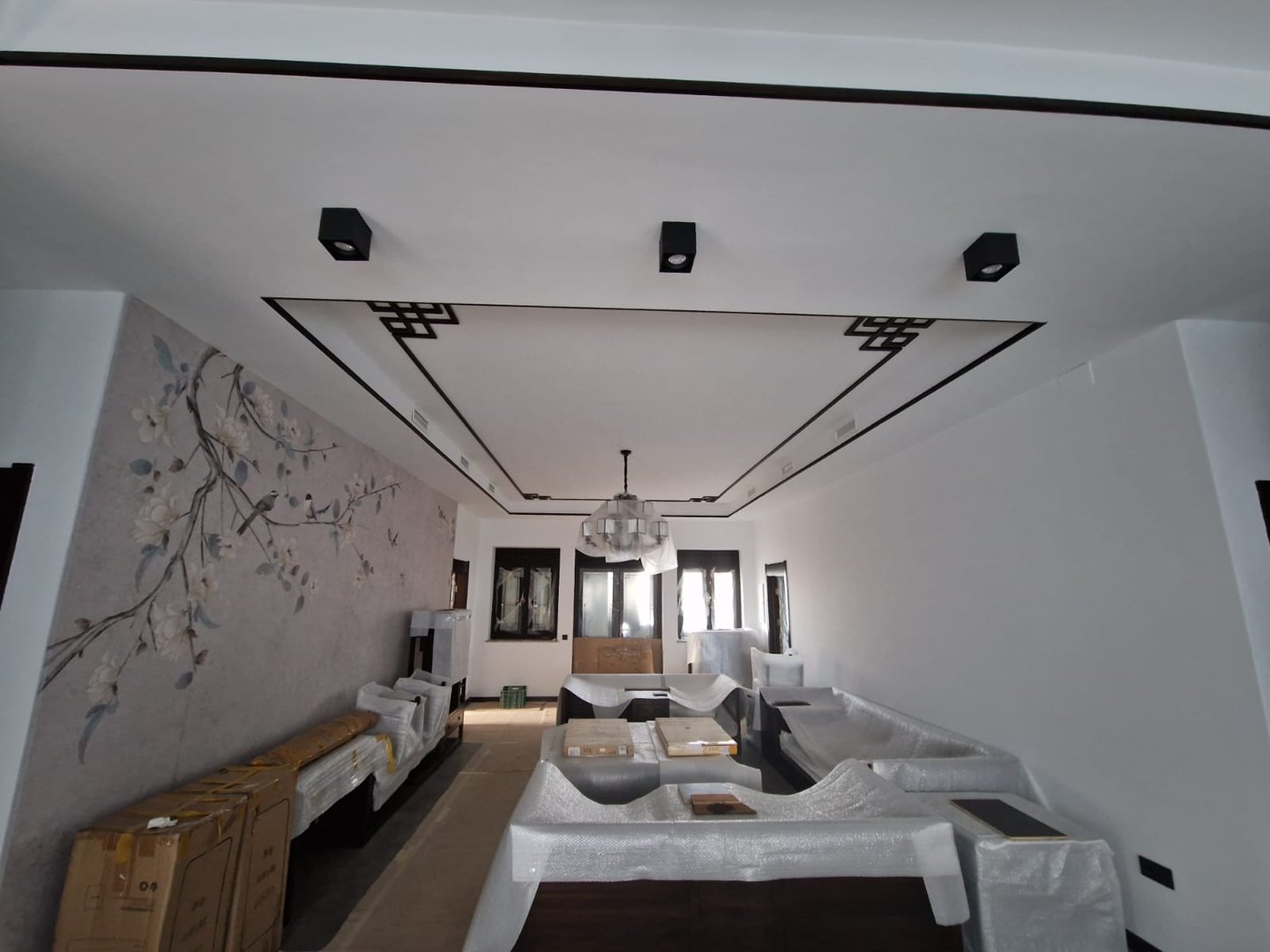 El interior refleja esta atención meticulosa. Las paredes están forradas con papel de arroz, delicado y simbólico. Los techos lucen artesonados minuciosamente decorados, y las puertas, mamparas y separadores siguen patrones estéticos tradicionales, fabricados en China y ensamblados en obra pieza a pieza.